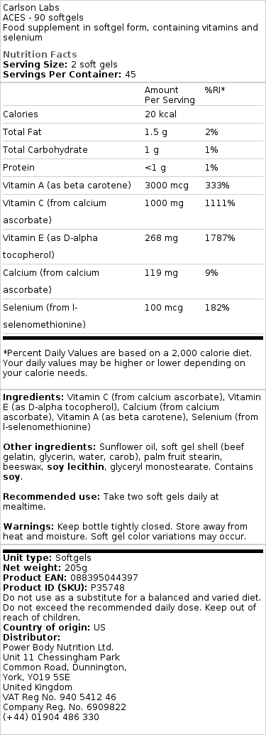 Die Inhaltsstoffe in Carlson Labs ACES stammen aus qualitativ hochwertigen Quellen und sind darauf ausgelegt, Teil eines aktiven Lebensstils zu sein. Genießen Sie das Gefühl, Ihrem Körper mit natürlichen Komponenten etwas Gutes zu tun.