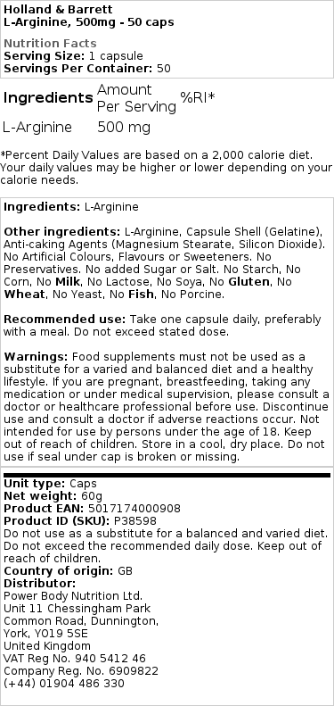 Entdecken Sie die Holland & barrett L-Arginin Kapseln, eine einfache Ergänzung für Ihren täglichen Bedarf. Jede Kapsel enthält 500 mg L-Arginin, eine Aminosäure, die in natürlichen Quellen wie Soja, Hühnchen und Rindfleisch vorkommt.