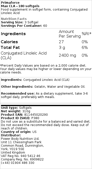 Entdecken Sie primaforce Max CLA, ein Nahrungsergänzungsmittel in praktischer Kapselform. Dieses Produkt enthält konjugierte Linolsäure (CLA), eine natürliche Fettsäure, die aus Fleisch- und Milchprodukten gewonnen wird.