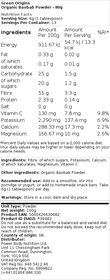 Hergestellt in Afrika und verpackt im Vereinigten Königreich unter strengen Qualitätskontrollen. Unser baobab-pulver ist von der Soil Association als ökologisch zertifiziert und von der Vegan Society als veganes Produkt anerkannt.