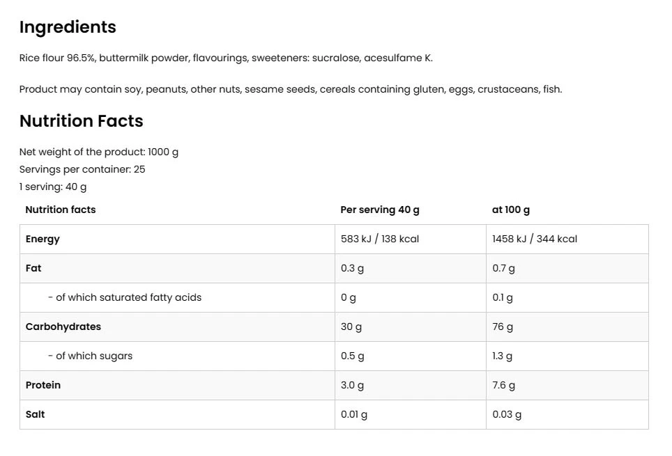 Dieses Produkt besteht aus fein gemahlenem Reis, angereichert mit einem Hauch von Biscuit- und Salzkaramell-Aroma für ein unvergleichliches Geschmackserlebnis. die Zutaten sind sorgfältig ausgewählt, um die natürliche Qualität zu gewährleisten.