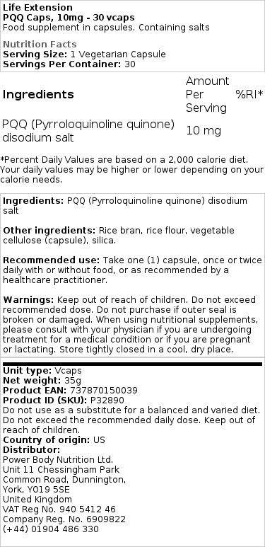 - Inhalt: Jede Packung enthält 30 Kapseln mit je 10 mg PQQ.
