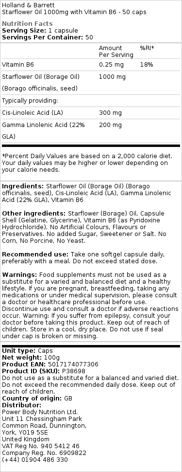 Holland & Barrett – Starfloweröl 1000mg mit Vitamin B6 – 50 Kapseln